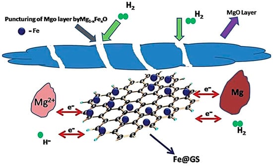 Bhatnagar et al. [] synthesized catalytic Fe3O4@GS composites using Fe3O4 nanoparticles and graphene sheets (GSs) and experimentally verified that such composites can improve the kinetics and thermodynamics of the performance of Mg-based hydrogen storage materials. Fe3O4@GS exhibited a superior catalytic effect during hydrogen desorption compared to GS or Fe3O4, with a lower onset hydrogen desorption temperature (262 °C) and desorption activation energy (90.53 kJ mol−1 H2), leading to an improvement in the hydrogen absorption rate and storage capacity. The enhancement of catalytic activity was mainly due to the synergistic effect of iron nanoparticles and GS. GS ensures a homogeneous dispersion of the Fe nanoparticles, preventing their agglomeration, increasing the effective surface area for catalysis, and improving the catalyst’s durability and stability. Furthermore, the variable valence of Fe enables GS to function as an intermediate carrier, accelerating charge transfer during the hydrogen absorption/desorption process (Figure 3).