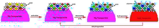 Xie et al. [] prepared Mg-5 wt%NiS/rGO nanocomposites using reduced graphene oxide (rGO) modified with nickel sulfide and nano-Mg powder as raw materials through hybrid ball milling. The composites exhibited excellent hydrogen desorption kinetics, rapidly desorbing 3.7 wt% of H2 in 10 min and 4.5 wt% of H2 in 60 min. It was found that 800 nm of nickel sulfides was completely transformed into catalysts such as MgS, Mg2Ni, and Ni after the first hydrogenation of the material. The excellent hydrogen desorption performance was derived from the highly dispersive catalysts, such as MgS, Mg2Ni, and Ni, which had a synergistic catalytic effect on the rGO flakes (Figure 4), and the formation of more nucleation sites between rGO flakes, catalysts, and the Mg matrix.