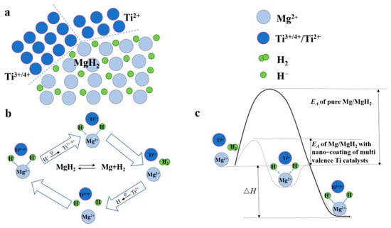 Many interfaces exist between MgH2, high and low valent Ti compounds during hydrogen desorption of Ti−based multivalence catalyst−doped MgH2 system (a), the multivalent Ti acts as an intermediate medium for electron transfer (b), the catalytic mechanism of multivalent Ti (c). Reprinted with permission from Ref. []. Copyright 2013, Royal Society of Chemistry.