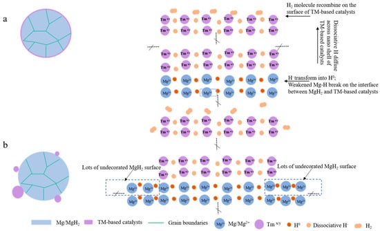 A section schematic of Mg−TM (a) and ball-milled Mg−TM−based catalyst (b). Reprinted with permission from Ref. []. Copyright 2014, Royal Society of Chemistry.