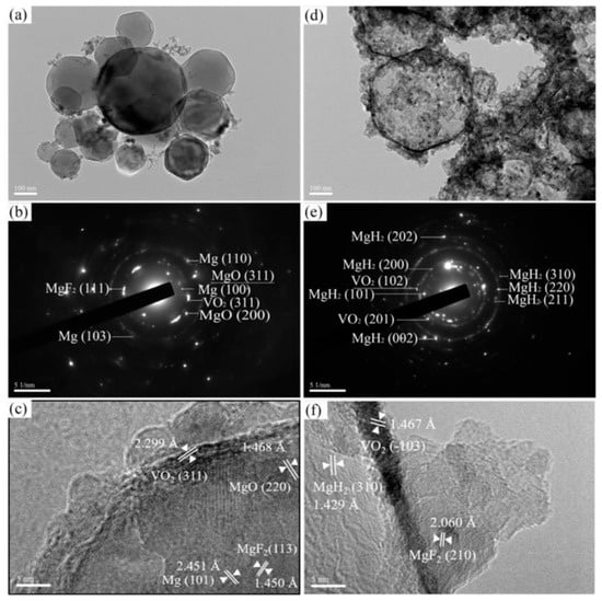 TEM images of the Mg-VF3 powder (a), the SAED pattern (b), and the HRTEM image (c). A micrograph of the hydrogenated Mg−VF3 powder (d), the SAED pattern (e), and the HRTEM image (f). Reprinted with permission from Ref. []. Copyright 2017, Elsevier.