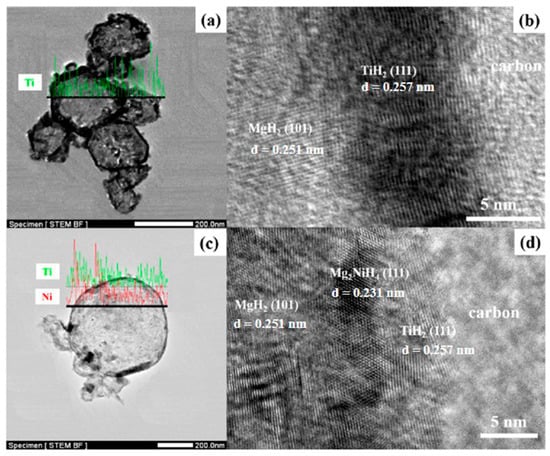 BF−STEM and HRTEM images of Mg@Ti (a,b) and Mg@Ti@Ni (c,d) composites after hydrogen absorption. Reprinted with permission from Ref. []. Copyright 2017, Elsevier.