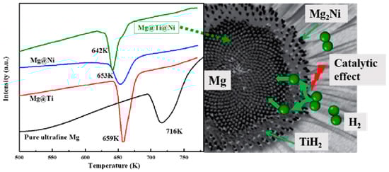 The peak dehydrogenation temperature of different materials and synergistic effects present in Mg@Ti@Ni composites. Reprinted with permission from Ref. []. Copyright 2017, Elsevier.
