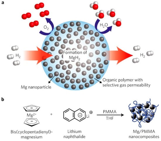 A schematic of high−capacity Mg NCs encapsulated by a selectively gas−permeable polymer (a), the synthesis of Mg NCs/PMMA nanocomposites (b). Reprinted with permission from Ref. []. Copyright 2011, Springer Nature.