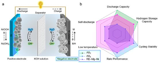 Schematic illustration of a Ni-MH battery (a) and radar chart comparison of AB2-type, AB5-type, and RE-Mg-Ni-based hydrogen storage alloys (b). Reprinted with permission from Ref. []. Copyright 2021, KeAi Publishing.