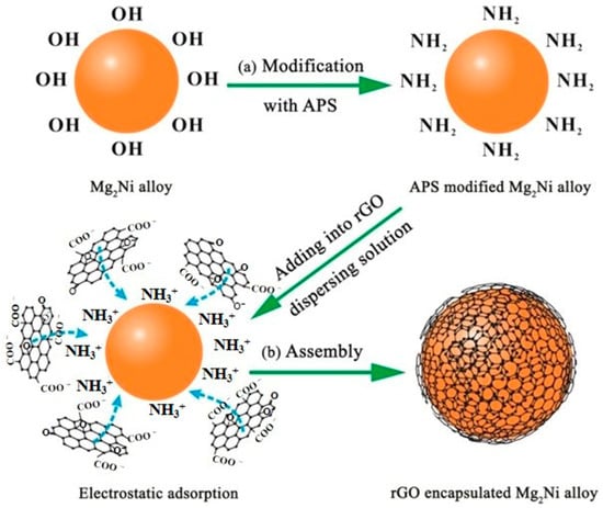 The preparation process of rGO−Mg2Ni: (a) APS modification; (b) electrostatic self-assembly. Reprinted with permission from Ref. []. Copyright 2017, American Chemical Society.