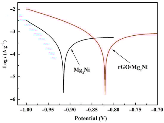 Du et al. [] synthesized an rGO-Mg2Ni composite by successfully coating reduced graphene oxide (rGO) on the surface of a Mg2Ni alloy with an amorphous structure to enhance the cycling stability of Mg2Ni as an electrode material (Figure 19). The material has a capacity of 557 m Ah g−1 after the 10th cycle, with a capacity retention rate of up to 94%. After 50 cycles, the capacity can also be maintained at 60%, which is significantly improved compared with the untreated Mg2Ni material. In addition, a Tafel polarization test of the electrode showed that the electrode material has high corrosion resistance in an alkaline solution (Figure 20). The structure of graphene provides a high-quality barrier that prevents direct contact between the hydroxyl groups in the alkaline electrolytes and the electrode during the charging/discharging process. The reduced graphene oxide coating treatment also accelerated the charge transfer and ion diffusion on the surface of Mg2Ni.