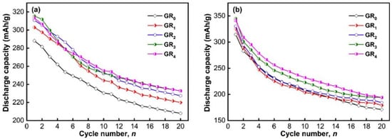 Evolution of the discharge capacity of the as-milled La9Ce1Mg80Ni5 + 200 wt% Ni + x wt% GR (x = 0–4) with cycle number: (a) Milling for 20 h, (b) milling for 80 h. Reprinted with permission from Ref. []. Copyright 2020, Elsevier.