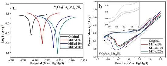 On the other hand, when Mg-based materials are prepared as electrodes for Ni-MH batteries, the main processes that occur at the electrodes during charging are the decomposition of water into H at the material’s surface and the diffusion of H to the surface and inside the material. When the counter-current is applied, H is released and oxidized to water [,]. Two main factors dictate the electrochemical kinetic performance of electrodes: the ability of hydrogen diffusion inside the material and the ability of charge transfer on the surface of the material [,]. Furthermore, electrons are conducted to the electrolyte through the propagation medium of the material surface, so a key factor influencing the electrode reaction is a surface with good electron conductivity. In addition, the surface of the electrode material is also highly susceptible to corrosion in alkaline electrolytes. As a result, the material surface’s ability to resist corrosion also plays a crucial role in determining the electrode’s cycling stability and service life.