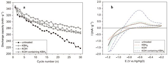 The performance of Ni-MH batteries depends not only on the bulk structure of the electrode but also on its surface state. Mg-based alloys are widely used as the negative electrode in Ni-MH batteries due to their exceptional electrochemical properties, cost-effectiveness, and abundant reserves of raw materials (Figure 16b) []. However, the appearance and growth of its MgO/Mg(OH)2 surface layer impede electron transport at the electrode/electrolyte interface and create a large discharge potential, resulting in a lower discharge capacity and a poorer kinetic performance of the electrode material []. Moreover, the interfacial reaction between the electrode material and the electrolyte can seriously affect the electrochemical performance of the batteries [,]. The optimization of the performance of Mg-based electrode materials and Ni-MH batteries can be achieved through surface treatment. Common methods of modification include surface coating, nanocrystallization and amorphization, and surface catalysis.