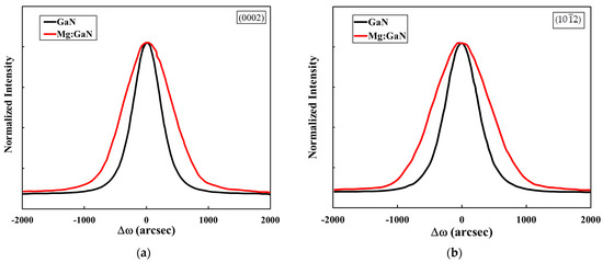 The threading dislocations for each sample were computed based on X-ray ω-scans rocking curve on the () and () diffraction peaks, which are shown in Figure 2. From these curves, the full width at half maximum of the reflections (FWHM) was assessed and used to determine the screw and edge dislocations. The threading dislocations were found equal to 2 × 108 cm−2 and 5 × 109 cm−2 for undoped GaN and Mg doped GaN layers, respectively. The observed increase of the threading dislocation density in Mg doped GaN layer is attributed to the presence of defects introduced during the incorporation of Mg atoms. Moreover, the use of N2 in the mixture of the carrier gas during the growth process of Mg doped GaN layer contributes to the increase of the threading dislocation density [20]. It has been earlier reported by Svensk et al. [21] that the introduction of Mg atoms contributes to the incorporation of point defects as long as N2 carrier gas is used and then the crystalline quality is spoiled. Moreover, Smorchkova et al. [22] reported that high incorporation of Mg atoms in the GaN layer leads to the formation of point defects and defect complexes, resulting in self-compensation, which is responsible for the observed low mobility and high resistivity in the p-type GaN layers, as similarly shown in this study. Kaufmann et al. [23] suggested that the nitrogen vacancy (VN) is a native defect with a significant concentration in p-type GaN layers grown by MOCVD. It was found that the concentration of VN is practically the same as that of the incorporated Mg, which is introduced through a substitutional mechanism with Ga atoms (MgGa). As a result, the MgGa-VN defect complex is formed through a self-compensation mechanism. Consequently, the observed decrease of electron mobility and the increase of resistivity of Mg doped GaN compared to undoped GaN layer corroborates the fact of introducing defects along with Mg atoms’ incorporation.