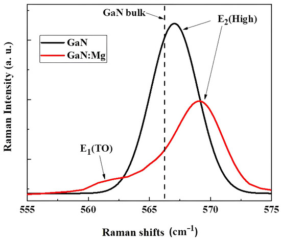 Figure 4 exhibits the Raman spectra of undoped GaN and Mg-doped GaN layers. The analysis of these spectra allows for the determination the stress states in both samples using the intense E2 (high) phonon frequency mode. This enables a direct comparison of the stress states relative to a reference peak [20]. The strain-free frequency of the E2 (high) phonon mode for the GaN bulk layer is located at 566.34 cm−1 [21] and it is represented by the dashed line. Both layers are under compressive stresses as they are located on the right side of the bulk GaN position. The spectrum of the Mg-doped GaN layer showed weakening and broadening of the E2 (high) peak at 568.4 cm−1, indicating lower crystalline quality compared to the E2 (high) peak at 566.8 cm−1 for the undoped GaN layer. Moreover, the introduction of Mg atoms induced higher compressive stress in the Mg-doped GaN layer compared to undoped GaN, leading to a shift of the E2 (high) peak towards higher wave numbers. To quantitatively assess the residual stresses inherent in both layers, the E2 (high) peaks are used to calculate these stresses using the method as reported in [22]. It was found that GPa and GPa. The minus sign (−) indicates that the residual stresses are of a compressive nature.