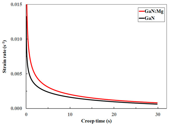 Creep strain rate as a function of the creep time for undoped GaN and Mg-doped GaN (GaN:Mg) layers using a maximum indentation force of 10 mN.