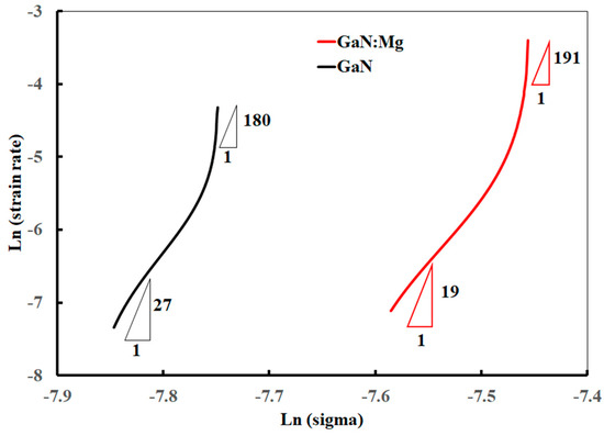 Logarithmic creep strain rate versus logarithmic stress curves for undoped GaN and Mg-doped GaN (GaN:Mg) samples under a load of 10 mN during the creep time of 30 s.