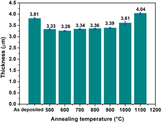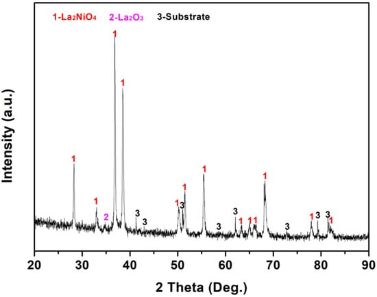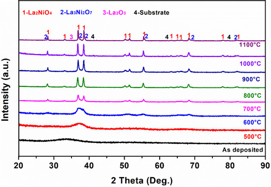 3.2. The Structure and Morphology Evolution of the La–Ni–O Coatings with the La/Ni Atomic Ratio of 2.04