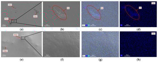 Figure 1e displays the microstructures of the surface of coating Cu65/MWCNT5 after 30 days of immersion in the 3.5 wt % NaCl solution. Compared with Figure 1a, Figure 1e shows that there were no flaws but many bulges on its surface. This is due to the high addition of MWCNTs forming a dense physical barrier structure [], resulting in increased fracture toughness of the coating and preventing the formation of flaws. Further magnification of the box in Figure 1e is shown in Figure 1f, and it revealed a rough but crack-free surface, as shown in Figure 1f. The surface zone of Figure 1f was performed by using the EDS mapping analysis, as shown in Figure 1g. The distribution of Cu elements as shown in Figure 1h, indicated the uniform distribution of the nano-Cu element within the coating. This was attributed to the effects of the adsorption of hydroxylated MWCNTs on Cu nanoparticles []. It indicated an even dispersion of nano-Cu within the epoxy coating. Cu65/MWCNT5 exhibited fewer defects compared to Cu65/MWCNT2.5, suggesting superior corrosion resistance in the former.