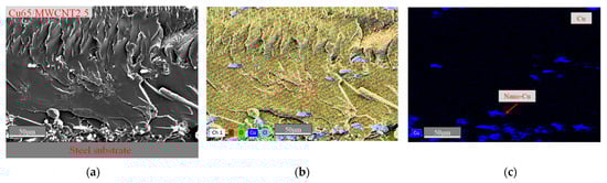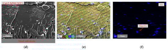 Figure 2a,d show SEM images of the cross-section of the Cu65/MWCNT2.5 and Cu65/MWCNT5 epoxy coating peeling from the steel surface after 30 days of immersion in a 3.5 wt % NaCl solution, respectively. In comparison to Figure 2d, Figure 2a reveals a substantial number of holes in the coating near the steel substrate interface. This suggests that increasing the weight percentage of MWCNTs from 2.5 to 5% strengthens the bond between the epoxy coating and the steel substrate. The cross-section of the coating component in Figure 2a,d was obtained using EDS mapping analysis. The distribution of C, O, Cu and Cl elements was detected, and is shown in Figure 2b,e. The distribution of C, O and Cl elements in Figure 2b,e was excluded, and the distribution of Cu elements is shown in Figure 2c,f. Figure 2c demonstrates the distribution of Cu through the cross-section of Cu65/MWCNT2.5. It was observed that most Cu nanoparticles clustered towards the bottom of the coating. This resulted in low surface conductivity due to the nonconductive epoxy resin present on the top surface. Figure 2f displays the copper distribution in the cross-section of the Cu65/MWCNT5 specimen. Compared to the distribution of nano-Cu in the epoxy coating of Cu65/MWCNT5 in Figure 2c, nano-Cu was distributed through the coating more evenly. These findings suggest that the addition of MWCNTs significantly influences the distribution of nano-Cu within the epoxy coating. The hydroxylated MWCNTs have an adsorption effect on the nano-Cu [], and prevent the nano-Cu from clustering at the bottom of the coating which, as a result, improves the coating surface’s conductivity.