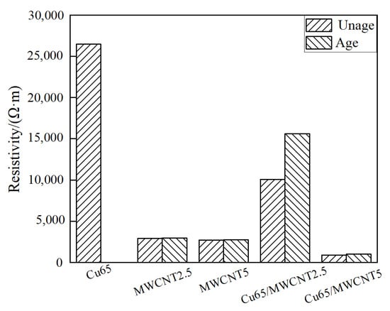 The resistivity of specimen Cu65/MWCNT5 declined one order of magnitude compared to that of coating MWCNT5. A high content of hydroxylated MWCNTs improved the dispersion of nano-Cu in the coating. In fact, since hydroxylated MWCNTs can adsorb nano-Cu [], adding hydroxylated MWCNTs enhances the uniform dispersion of the nano-Cu in the resin matrix. The high density of nano-Cu and the large mean free path of hydroxylated MWCNTs led to a higher conductivity in the nano-Cu/MWCNT epoxy coatings than that of the hydroxylated MWCNT epoxy coating and nano-Cu epoxy coating []. When the content of hydroxylated MWCNTs drops from 5.0 to 2.5%, the resistivity of the nano-Cu/MWCNT epoxy coating increases. For example, the resistivity of specimen Cu65/MWCNT2.5 was one order of magnitude higher than that of specimen MWCNT2.5, which was due to the high density of nano-Cu deposited at the bottom of the coating with hydroxylated MWCNTs, thickening the nonconductive epoxy resin on the surface and increasing the surface resistivity.
