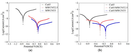 The Tafel polarization curves of the (a) Cu epoxy or MWCNT epoxy coatings and (b) the anticorrosive conductive Cu/MWCNT epoxy coatings soaked in the 3.5 wt % NaCl solution for 30 days.