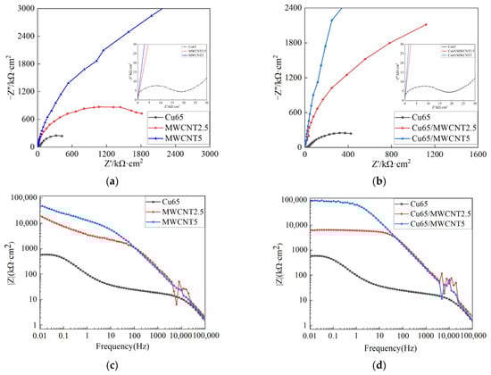 The low-frequency impedance modulus () was employed to evaluate the anticorrosion property of the coatings []. The Bode plots made it possible to directly compare the () of different coatings. Figure 5c illustrates that the impedance moduli () for specimens Cu65, MWCNT2.5, and MWCNT5 were 5.73 × 102 kΩ·cm2, 1.94 × 104 kΩ·cm2, and 4.77 × 104 kΩ·cm2, respectively. The impedance modulus of the MWCNTs epoxy coatings was two orders of magnitude higher than that of the nano-Cu epoxy coating, signifying that the MWCNT epoxy coatings exhibited superior anticorrosion properties. Figure 5d reveals that the impedance moduli () of specimens Cu65/MWCNT2.5 and Cu65/MWCNT5 were 6.35 × 103 kΩ·cm2 and 9.67 × 104 kΩ·cm2, respectively. Notably, the impedance modulus of coating Cu65/MWCNT2.5 was 67.3% lower than that of specimen MWCNT2.5, while the impedance modulus of specimen Cu65/MWCNT5 was 102.7% higher than that of coating MWCNT5. The presence of MWCNTs in the Cu65/MWCNT epoxy coatings significantly affected the low-frequency impedance modulus. At an MWCNT content of 2.5%, the nano-Cu became the coating’s weak region, and corrosive ions created a corrosion path through the corrosion of the copper nanoparticles. However, when the MWCNT content rose to 5%, they formed a dense structure that hindered the entry of corrosive ions, and nano-Cu filled the pores between MWCNTs, thus extending the corrosion paths.