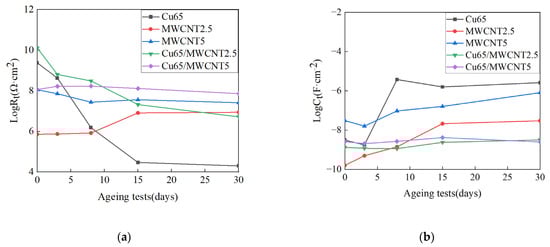 Figure 7 represents the Rt and Ct of the specimens in the 3.5 wt % NaCl solution. Figure 7a shows that the Rt of coatings Cu65 and Cu65/MWCNT2.5 decreased with an extended immersion period. This is because the nano-Cu in the coating oxidizes into CuO during immersion in the NaCl solution, which forms a gap between the CuO and the epoxy, allowing the charge to directly penetrate the coating and infiltrate the matrix. The Rt of specimen Cu65/MWCNT2.5 declined more slowly than that of coating Cu65 as the immersion period lengthened, due to the dense structure formed by the corrosion-resistant MWCNTs which inhibited the charge transfer in the coating. Interestingly, the Rt of coating MWCNT2.5 also diminished with an extended immersion period. This is because the low addition (2.5%) MWCNT epoxy coating behaved similarly to a pure epoxy coating at the initial corrosion stage []. As corrosion progressed, the MWCNTs increasingly obstruct the corrosive ions, leading to an extension of the corrosion path and an increase in coating resistance. The Rt of coatings MWCNT5 and Cu65/MWCNT5 remained high, with their final charge-transfer resistance exceeding that of the other coatings. This is attributable to the dense structure formed by the high addition MWCNTs. This structure effectively blocks the entry of the corrosive medium, prevents the oxidation of nano-Cu, and enhances the coating’s toughness, thus inhibiting crack formation and charge transfer.