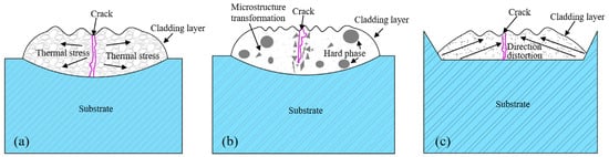 The laser cladding process is very complex, and the coating generates significant stresses during the cladding and cooling process. When the stresses in the coating exceed the yield limit of the coating material, they can lead to cracking of the coating. The formation of cracks in laser-clad coatings can be attributed to the presence of residual stresses, which can be categorized into three primary types: thermal stresses, organizational stresses, and restraint stresses (Figure 3) [42,43,44].
