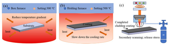 Preheating the substrate can reduce the temperature gradient between the coating and the substrate, thereby lowering thermal stress and decreasing the susceptibility of the coating to cracking (Figure 5a). However, excessive preheating can lead to increased crack length, necessitating careful control of the preheating temperature [29]. Ding et al. [115] conducted experiments using different preheating temperatures on Q460E substrates with 12CrNi2 coatings and developed a finite element residual stress analysis model. Their findings demonstrated that preheating effectively reduces residual stresses in the coatings. Bidron et al. [116] conducted repair studies on CM-247LC high-temperature alloy and determined that using low energy input and an induction preheating temperature close to 1100 °C was highly effective in preventing specimen cracking. Moreover, to address various concerns, Zhou et al. [117] proposed the laser induction hybrid rapid cladding (LIHRC) technique, which solved the problem of substrate damage caused by preheating. This technique not only improved cladding efficiency but also resulted in crack-free composite coatings.