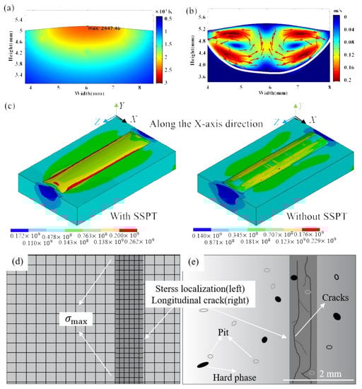 The presence of thermal stress in laser-clad coatings can be attributed to the disparate modulus of elasticity and coefficient of thermal expansion between the substrate and the clad material. This results in varying rates of thermal expansion and cooling contraction within the clad layer. When a temperature gradient exists, the clad layer experiences stress, known as thermal stress (Figure 3a) [45]. If the thermal stress surpasses the material’s yield limit, it can give rise to cracks in the coating. The calculation of thermal stress involves determining the extent of the stress [45].
