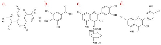 Chemical structures of the dye molecules in G. caespitosum. (a) Ellagic acid. (b) Gallic acid. (c) Hyperoside. (d) Quercetin.