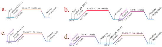 Scheme of dyeing process: (a) dyeing without mordant; (b) post–mordanting; (c) meta–mordanting; (d) pre–mordanting.
