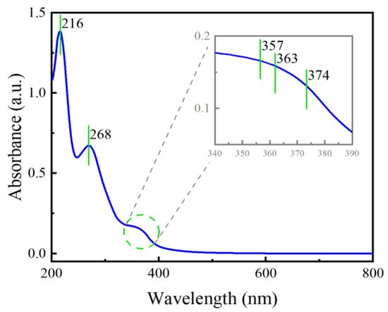 Plant dyes typically contain chromophores in their structure. Chromophores must contain a conjugate system that can absorb visible electromagnetic radiation in the UV-visible range, thus, causing electron transition [46]. In order to qualitatively analyze the presence and types of these plant secondary metabolites in the G. caespitosum extract, we used UV-visible spectroscopy. Figure 3 shows that the G. caespitosum extract has obvious absorption in the ultraviolet range (200–400 nm), with strong absorption peaks at 216 nm and 268 nm, and a weaker absorption peak around 360 nm. There was no absorption in the visible light range (400–800 nm). In comparison with the literature, it can be inferred that the G. caespitosum extract contains phenolic acid and flavonoid components, with gallic acid at 216 nm [47] and 268 nm [48], ellagic acid at 357 nm [49], hyperoside at 363 nm [50], and quercetin at 374 nm [51]. However, more precise analysis is currently unavailable and further studies will be carried out in the future.