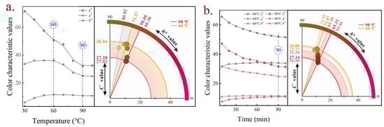 Dyeing temperature is an important factor that affects the dyeing quality, as it affects the kinetic energy of dye molecules in the dye bath and the degree of expansion of the wool fibers. Figure 4a shows the color characteristic values of dyed fabrics under different dyeing temperatures. As the dyeing temperature increased, the L* value gradually decreased and then stabilized, while the a* and b* values first increased, slowly, and then decreased before stabilizing. At 60 °C, the a* and b* values both reached their highest points (a*: 11.58, b*: 36.24), with yellow as the main color and red as the secondary color. In addition, the C* value reached the highest point (38.04). Furthermore, the h° value was 72.27°. The apparent color of the dyed wool fabrics was brownish-yellow. When the temperature increased from 60 °C to 90 °C, the color characteristic values decreased and reached a stable state, with the L* value from 50.72 to 32.24, the a* value from 11.58 to 10.78, the b* value from 36.24 to 24.98, the C* value from 38.04 to 27.20, and the h° value shifting from 72.27° to 66.66°. In addition, the apparent color of the dyed wool fabrics changed from brown-yellow at 60 °C to dark brown at 90 °C, which were in the yellow-red region.