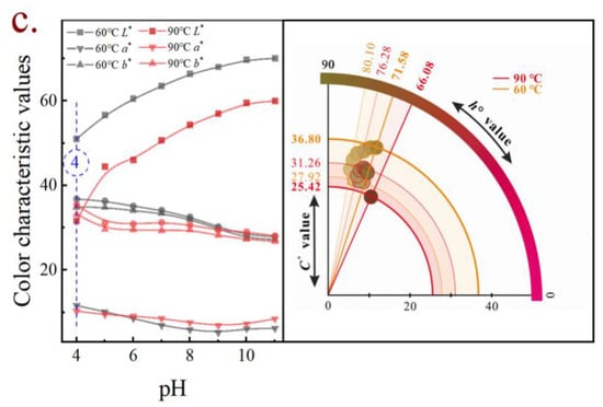 The pH of the dye solution is one of the most important factors affecting the dyeing process. As the pH of the dye solution increased, the L* value gradually increased, and the a* and b* values gradually decreased. The apparent color of the dyed wool fabrics became gradually lighter. When the pH was 4.0, both the a* and b* values reached the highest point with an a* of 11.62 and a b* of 34.90 at 60 °C, and with an a* of 10.30 and a b* of 23.24 at 90 °C. The L* value reached its lowest value of 51.00 at 60 °C and of 31.60 at 90 °C. The C* value was at its maximum value of 36.80 at 60 °C and at its minimum value of 25.24 at 90 °C. The h° value was 71.58° at 60 °C and 66.08° at 90 °C. At this point, the color characteristic values were optimal.