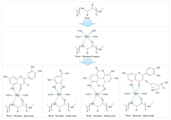 Natural dyes exhibit a high affinity for natural fibers, particularly for protein-based fibers. Wool, belonging to the protein fiber category, primarily consists of keratin, which consists of long chains of amino acids linked together by peptide bonds. Within the keratin structure, various types of chemical bonds and intermolecular forces play a role in determining the properties of wool. These include disulfide bonds, ionic bonds, hydrogen bonds, and van der Waals forces. The combination of these bonding forces and interactions results in a three-dimensional network of intertwined keratin chains, forming the complex and unique structure of wool. This advanced structure provides wool with its desirable properties, such as elasticity, resilience, moisture absorption, insulation, and durability. Wool is recognized as a high-quality and mid-to-high-end fabric [41]. The molecular structure of wool contains a large number of alkaline and acidic side chain groups, exhibiting amphoteric properties in aqueous solutions [42,43]. Under alkaline conditions, the protein’s polypeptide chains break, disulfide bonds hydrolyze, and ionic bonds dissociate, leading to damage to the keratin structure, resulting in yellowing of the wool, reduced sulfur content, and partial dissolution [42,43]. Under acidic conditions, the ionic bonds in the keratin structure dissociate; furthermore, wool fabrics have a high affinity for anionic plant dyes [44].