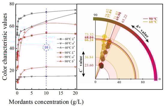 Using the meta-mordanting process, the effect of the concentration of the mordant on the color characteristics of the dyed fabrics is shown in Figure 6. As the mordant concentration increased, the L* value gradually increased, indicating a decrease in dye absorption. This suggests that the dye was desorbed from the fabrics and interacted with the mordant to form insoluble complexes. The a* and b* values increased significantly. When the mordant concentration reached 10 g/L, except for the continuing increase in the b* value at 60 °C, most of the other color characteristic values reached their maximum point. This indicated that the binding sites (carboxyl and amino groups) on the fabrics were exhausted and had reached a saturation state. In addition, the color of the dyed fabrics gradually changed from brownish-yellow (dyeing without mordant) to the optimal dyeing color. The hue angle h° shifted noticeably. When the concentration reached 10 g/L, the L* value (72.84 at 60 °C and 54.30 at 90 °C), a* value (13.92 at 60 °C and 23.40 at 90 °C), b* value (64.78 at 60 °C and 63.90 at 90 °C), and C* value (66.24 at 60 °C and 68.04 at 90 °C) all stabilized. The h° value was 77.84° at 60 °C and the color was bright yellow. At 90 °C, the h° value was 69.90° and the color was golden. Therefore, the optimal mordant concentration was 10 g/L.