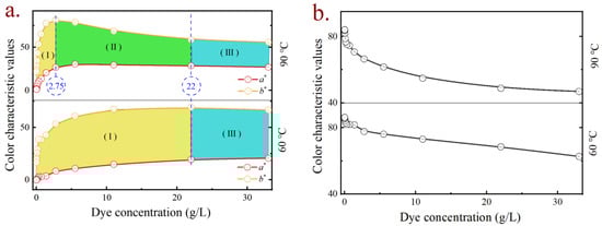 From Figure 7b,c, as the dye concentration increased, the L* value gradually decreased as the equidistant difference of the a* and b* values changed from stage I to stage III. The range of the C* value gradually increased, and the h° value produced a shift of 17°–20°. When the dye concentration reached 22 g/L, the C* values were 71.92 and 64.07 at 60 °C and 90 °C, respectively, and the h° values were 74.34° and 66.12°, respectively. This is because increasing the dye concentration can increase the coloring strength and adsorption of wool fibers. However, the amount of dye molecules bound to wool fibers is limited. When the amount of dye absorbed or diffused reaches saturation, the color characteristic values tend to be stable [55]. Therefore, the optimal dye concentration at 60 °C and 90 °C was 22 g/L.