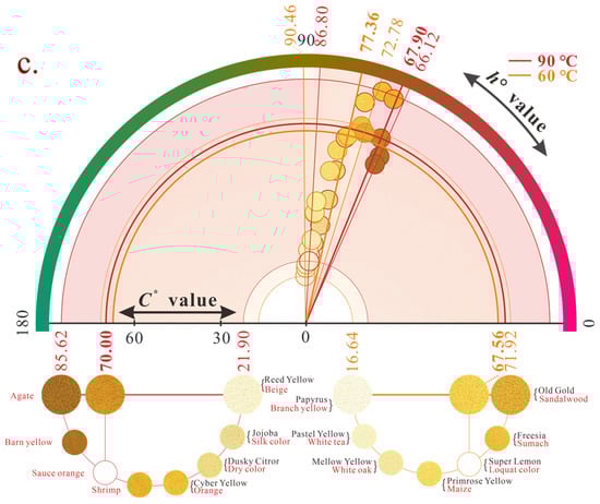 As shown in Table 4, under the conditions of a dyeing temperature at 60 °C and a dye concentration at 5.50 g/L, the color characteristic values of the dyed samples were L* = 76.14, a* = 10.92, b* = 60.82, C* = 61.82, and h° = 79.84, which was a bright yellow color. Under the conditions of a dyeing temperature at 90 °C and a dye concentration at 0.17 g/L, the color characteristic values of the dyed samples were L* = 76.72, a* = 7.68, b* = 43.40, C* = 44.04, h° = 79.98, which was golden yellow. Comparing these with traditional Chinese colors, both colors are relatively precious in traditional Chinese clothing [56].