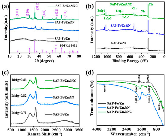 (a) XRD patterns of SAP-Fe/Zn, SAP-Fe/Zn&N, and SAP-Fe/Zn&NC samples; (b) XPS full spectrum; (c) Raman spectrum; (d) infrared spectrum.