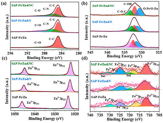 XPS fine spectrum of element (a) C of SAP-Fe/Zn, SAP-Fe/Zn&N, and SAP-Fe/Zn&NC samples; (b) XPS fine spectrum of O element; (c) XPS fine spectrum of Zn; (d) XPS fine spectrum of Fe element.