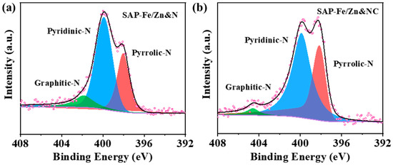 (a) XPS fine spectrum of N element in SAP-Fe/Zn&N sample; (b) XPS fine spectrum of N element in SAP-Fe/Zn&NC.