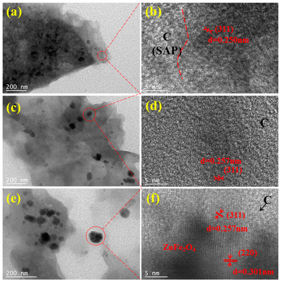 In order to better understand the morphology and structure of the composites, the prepared SAP-Fe/Zn, SAP-Fe/Zn&N, and SAP-Fe/Zn&NC were tested via TEM, as shown in Figure 5. In the TEM image of SAP-Fe/Zn, SAPs wrapped with some metal nanocrystals were observed (Figure 5a). By comparing this with the XRD image, the nanocrystals were identified as being ZnFe2O4, and the lattice spacing was captured as 0.250 nm using a high-resolution transmission electron microscope (Figure 5b), corresponding to the (311) crystal plane of the nanocrystal. Through the previous scanning image study, it was found that the microstructure of the SAP-Fe/Zn&N samples was irregular carbon clusters. Further transmission electron microscopy (TEM, Tecnai G2F 20, FEI, Morristown, NJ, USA) test results show that these carbon clusters are composed of randomly oriented irregular carbon layers (Figure 5c,d). For SAP-Fe/Zn&NC, as shown in Figure 5e,f, the microstructure also shows that the amorphous carbon structure is wrapped around the dark nanocrystals, and the nanocrystal structure is clear and complete. Combining SEM images with EDS-mapping (Smart EDX, ZEISS, Oberkochen, Germany), it can be observed that the distribution of Fe and Zn elements is similar, which is related to the encapsulated nanocrystals. The dark spots with uniform internal distribution and uniform size indicate the crystal state of ZnFe2O4. In addition, N has a similar distribution, which is because the carbon layer outside the nanocrystals is highly doped with N. From the above discussion, we can confirm that the combination of nitrogen-doped ZnFe2O4 and the SAP carbon matrix was completed in SAP-Fe/Zn, SAP-Fe/Zn&N, and SAP-Fe/Zn&NC composites, which verifies the previous test results and is beneficial for improving the lithium storage performance of electrode materials.