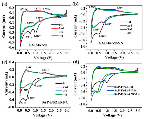 (a) Cyclic voltammetric curve of SAP-Fe/Zn electrode; (b) cyclic voltammetric curve of SAP-Fe/Zn&N electrode; (c) cyclic voltammetric curve of SAP-Fe/Zn&NC electrode; (d) comparison of the first-cycle voltammetric curves of SAP-Fe/Zn, SAP-Fe/Zn&N, and SAP-Fe/Zn&NC electrodes.