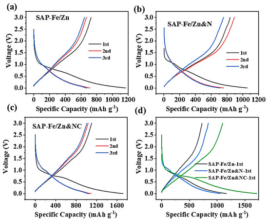 (a) Charge–discharge curve of SAP-Fe/Zn electrode; (b) charge–discharge curve of SAP-Fe/Zn&N electrode; (c) charge–discharge curve of SAP-Fe/Zn-NC electrode; (d) comparison of the first charge–discharge curves of the SAP-Fe/Zn, SAP-Fe/Zn&N, and SAP-Fe/Zn&NC electrodes.