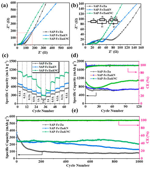 (a) EIS curves of SAP-Fe/Zn, SAP-Fe/Zn&N, and SAP-Fe/Zn&NC electrodes; (b) EIS curve (equivalent circuit); (c) rate performance curve; (d) 0.1 A g−1 cycle curve comparison; (e) comparison of 2 A g−1 cycle curves.