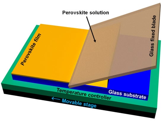The CSA coater (schematically depicted in Figure 1) comprised a moving translational stage that employed a linear actuator from Zaber Technologies (Zaber, Vancouver, BC, Canada) and had the capacity to reach speeds ranging between ~ 4.7 μm/s and 8 mm/s. A cover glass acting as a blade was fixed in the near vicinity of the substrate at the desired angle, while the perovskite solution was placed on the glass substrate, underneath and nearby the edge of the blade. The temperature of the substrate could be regulated between 15 °C and 35 °C by employing a water-controlled system (Accel 250 LC) acquired from Thermo Scientific (Waltham, MA, USA).