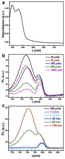 Finally, we dedicate the last section of this study to the emission properties displayed by the obtained hybrid lead halide CH3NH3PbI3-xClx perovskite crystalline structures. In order to infer the most appropriate excitation wavelength for such films, first we have measured the absorption spectrum of a dried perovskite film deposited using the spin coating method. As can be observed in Figure 5a, the perovskite film presented a clear absorption peak at a wavelength of about 300 nm, while at a longer wavelength of 355 nm, another less prominent peak could further be noticed. These results are in good agreement with other reports published in the literature on hybrid CH3NH3PbI3-xClx perovskites [74]. Therefore, we decided to employ the wavelength of 300 nm as the excitation wavelength.