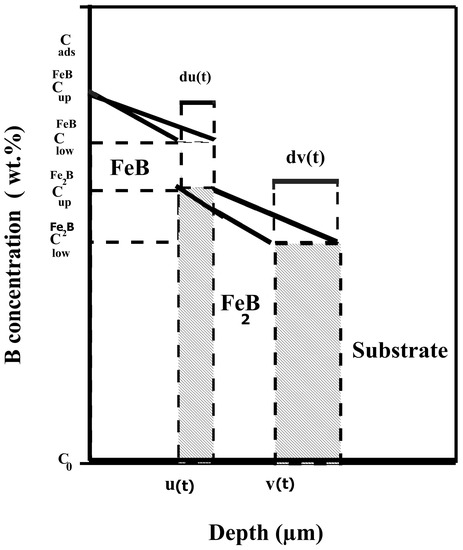The boron concentrations with low and upper limits were the following: (=16.40 wt.% B), (=16.23 wt.% B) for the FeB phase, and (=9 wt.% B) and (=8.83 wt.% B) for the Fe2B phase [22,23]. The variable is the position of the first interface, and refers to that of the second interface. is the required boron content being adsorbed at the onset of a process [25]. represents the solubility limit of boron in the matrix, which is equal to 35 × 10−4 wt.% B [31]. The change in time of the FeB layer’s thickness follows Equation (1).