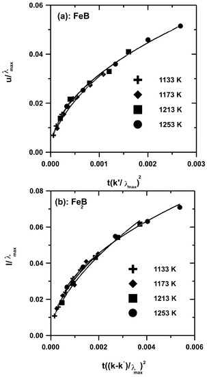 Relationships between the dimensionless groups in each layer: (a) FeB and (b) Fe2B.