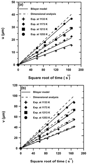 with R = 8.314 J mol−1K−1 and is the process temperature in Kelvin. For applying the based dimensional analysis model, the time dependencies of parabolic growth constants were therefore necessary for the calculation. The corresponding expressions of and are provided by Equations (16) and (17), respectively, after the experimental values of Table 1 were fitted with Arrhenius relations: