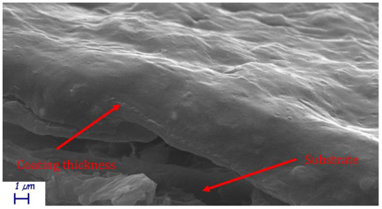 The theoretical critical pigment volume concentration for kaolin is reported to be around 60% [11]. Given its density, 60% kaolin content by weight leads to almost 38% volume concentration. The spatula rub-out test resulted in 41% CPVC, similarly to a previous work [31]. Since the pigment volume concentration (PVC) was close to the CPVC just determined, the authors needed to assess void absence in the coatings. Samples cross sections were then SEM analyzed. A representative SEM micrograph of a H39K 40 cross section is visible in Figure 1, showing no visible void in both the coat cross-section and coat surface, hence PVC < CPVC.